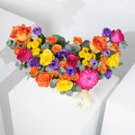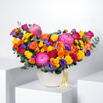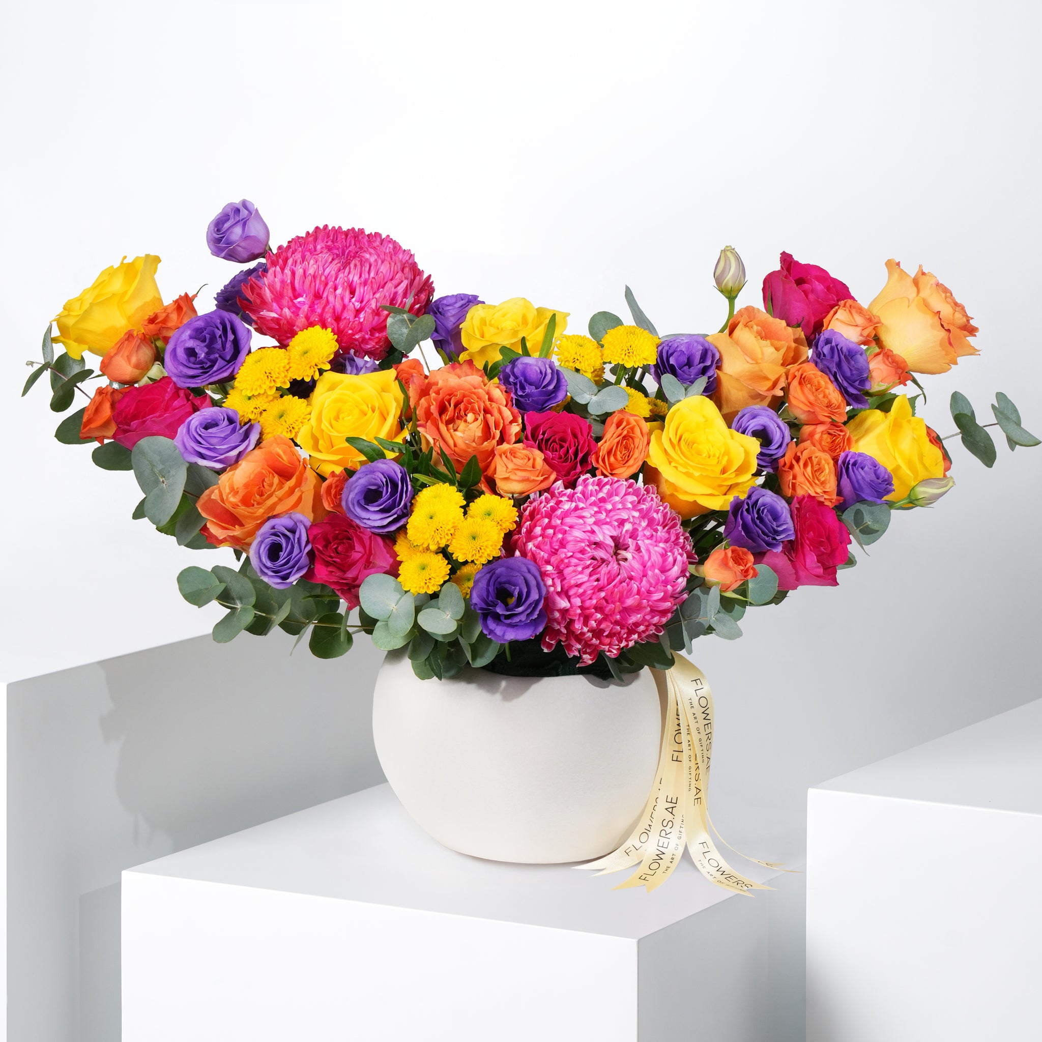 A vibrant medley of roses, chrysanthemums, lisianthus, and eucalyptus styled in a modern vase. Bright, cheerful, and ready to display—an ideal gift to bring joy and elegance to any occasion.