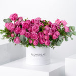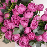 Simply stunning, purple spray Roses with Eucalyptus leaves. The pictures speak for themselves on this fabulous arrangement.