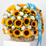 A soft yet striking palette of white roses, sunny sunflowers, and blue oxypetalum, thoughtfully styled in a classic hatbox. A fresh summer expression for new beginnings, congratulations, or just because.