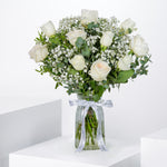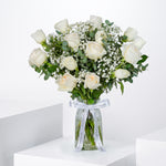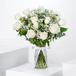 Elegant and timeless, the Perfect White Glass Vase features a stunning arrangement of O'hara white roses, White Countdown roses, and delicate gypsophila. The pure white tones symbolize grace, purity, and serenity, making it a perfect choice for any occasion—from celebrations to heartfelt gestures.