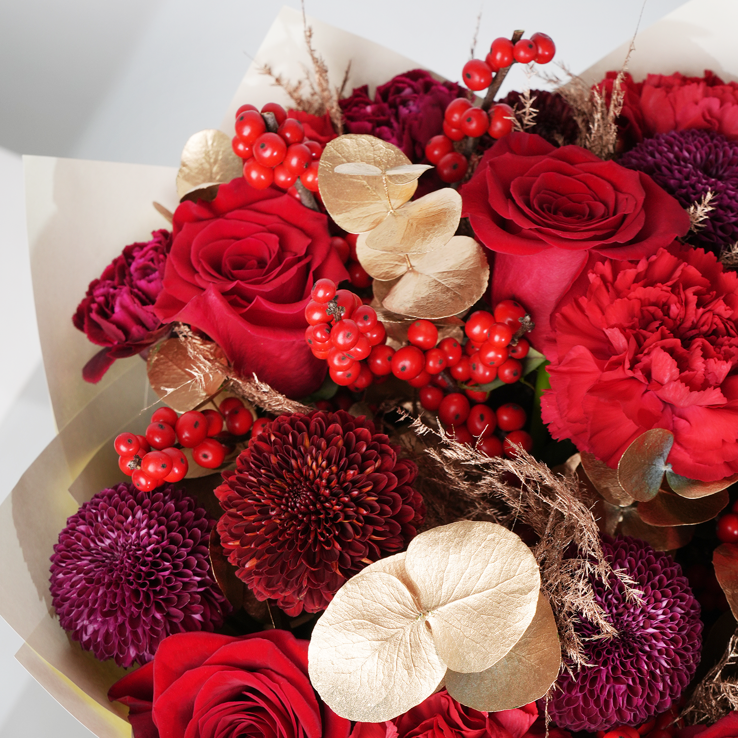 A festive blend of rich red roses, deep burgundy carnations, ping-pong chrysanthemums, and bright Ilex berries, enhanced with aromatic Nobilis and shimmering gold eucalyptus. This hand-tied bouquet captures the warmth, sparkle, and magic of the season.