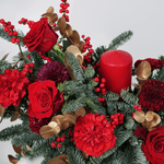 A warm and enchanting centerpiece designed with rich red roses, burgundy carnations, festive ping-pong chrysanthemums, and bright Ilex berries. Accented with fragrant Nobilis and shimmering gold eucalyptus, this arrangement is completed with two elegant candles, creating a glowing, cozy ambiance perfect for intimate seasonal gatherings.