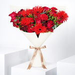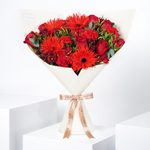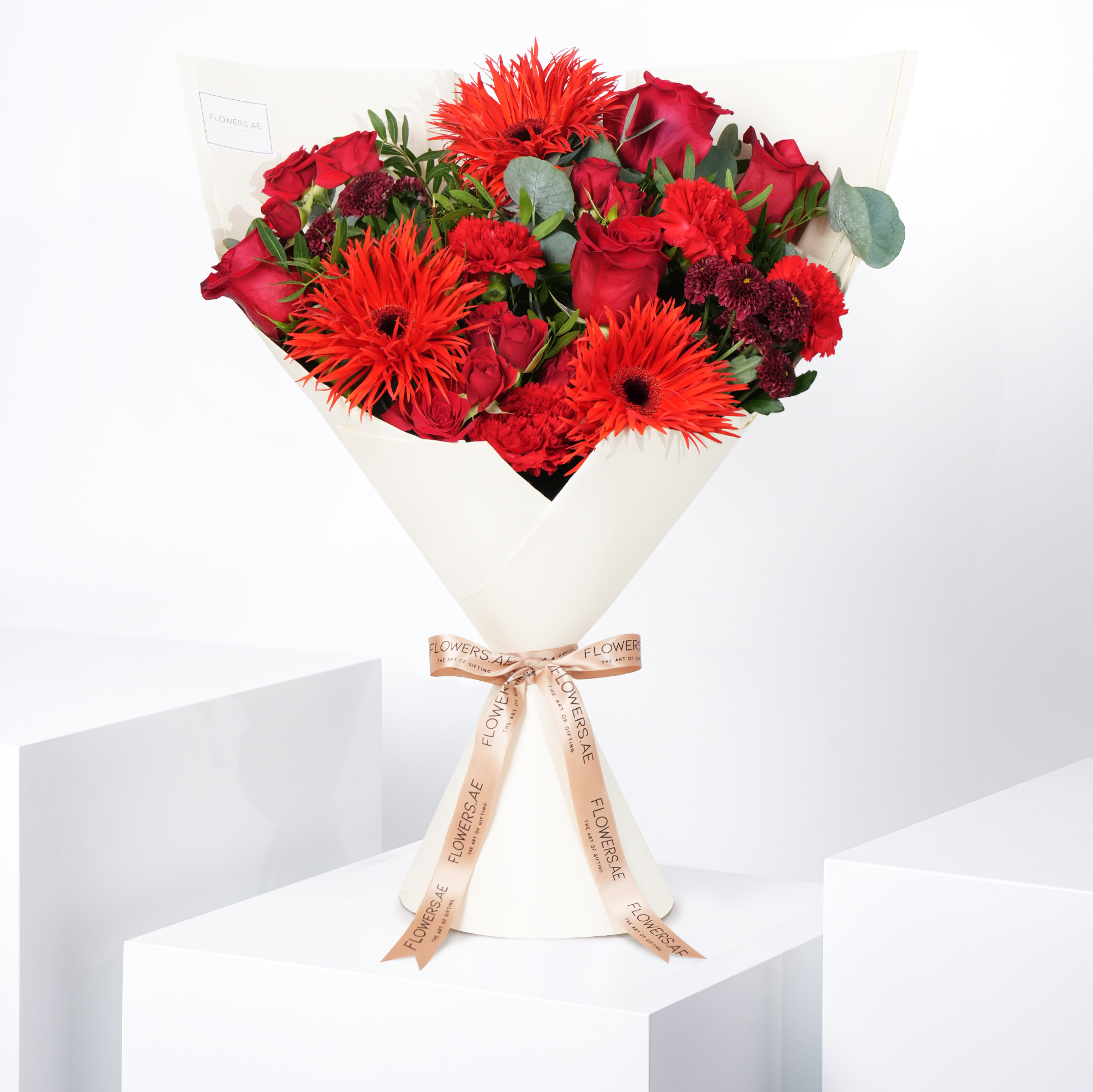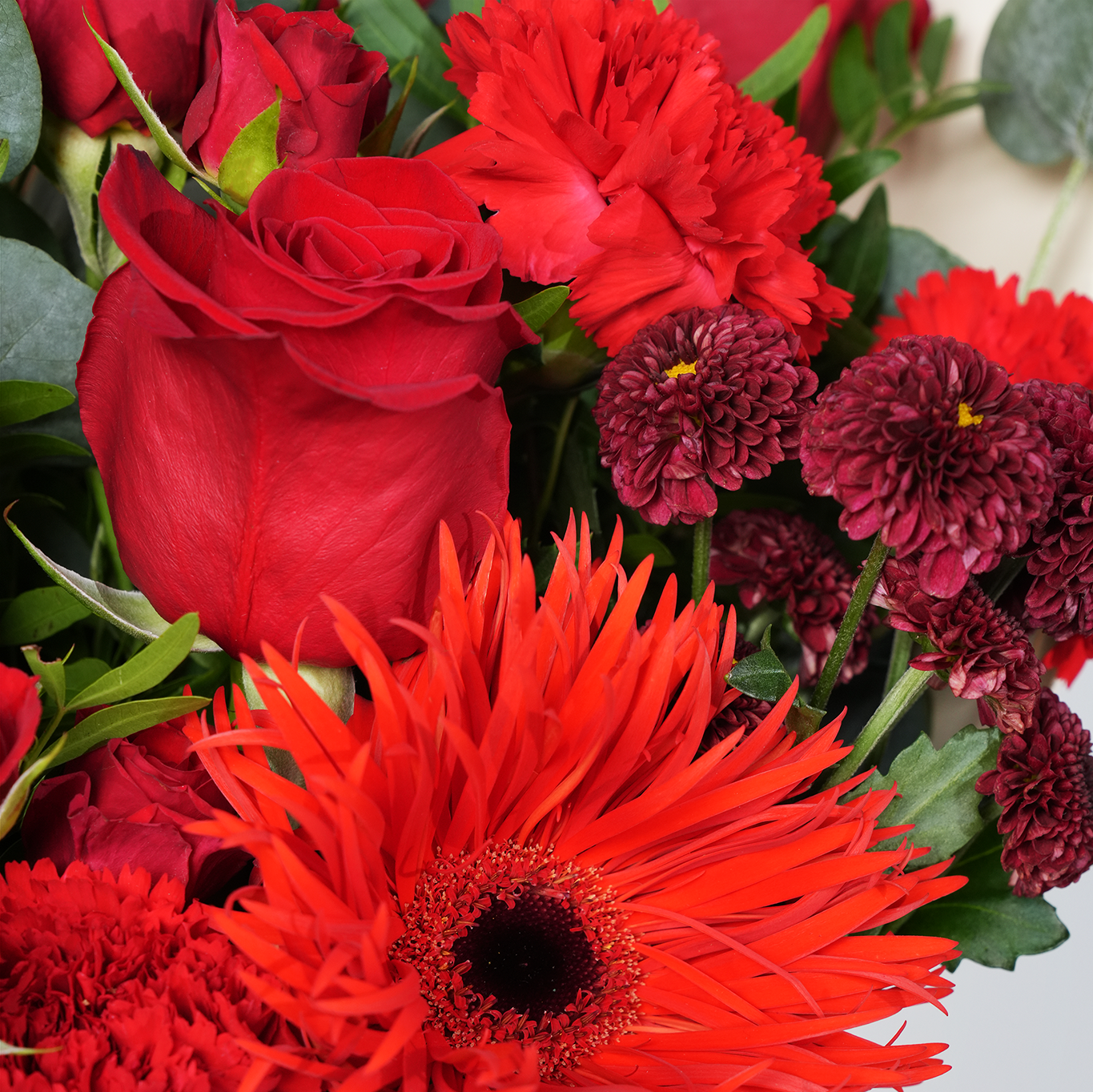 A vibrant mix of bold red blooms, this bouquet features red roses, carnations, gerberas, and chrysanthemums. Paired with fresh pistache and eucalyptus, it creates a rich, romantic arrangement full of depth.