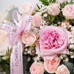 A breathtaking table centerpiece showcasing a graceful blend of Rose Ohara White and Rose Ohara Pink, accented with Spray Rose Bombastic and delicate gypsophila. Thoughtfully designed for Ramadan and Eid, Adelle is a timeless table centerpiece that brings elegance and charm to festive gatherings.