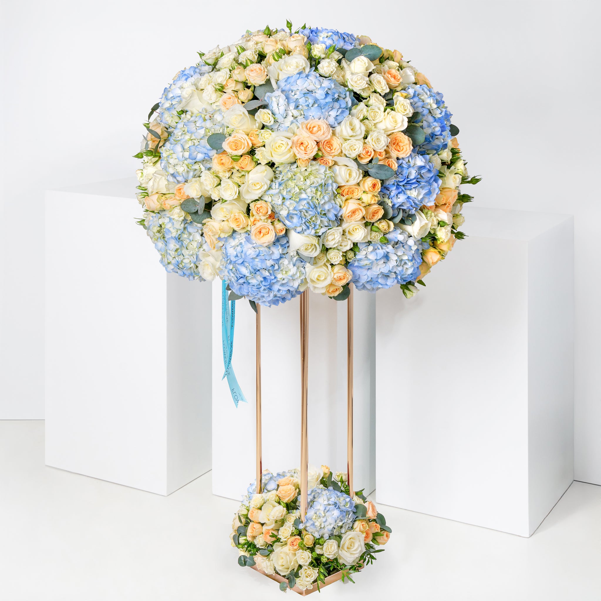 A delicate selection of premium blue hydrangeas, white roses, white spray roses and spray roses selenora, complimented with Eucalyptus leaves elegantly arranged in a stand.