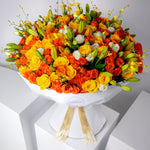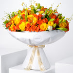A golden celebration of autumn’s beauty, this bouquet glows with sunny yellow roses, vibrant orange roses, crisp white lisianthus, and radiant orange lilies.