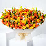 A golden celebration of autumn’s beauty, this bouquet glows with sunny yellow roses, vibrant orange roses, crisp white lisianthus, and radiant orange lilies.