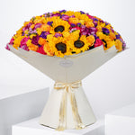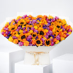 Featuring vibrant sunflowers, orange and yellow roses, deep purple roses, fuchsia and purple carnations, pink and purple statice, and eucalyptus and pistach leaves. It's the perfect gift for a colourful anniversary!