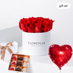 A sweet gesture for your special day. Our Petite Red Roses Hatbox features premium blooms in a stylish box tied with a black ribbon—a charming way to say I love you on your anniversary.