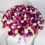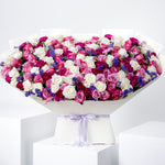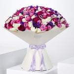 A luxurious arrangement in our signature Grand style, showcasing purple & white roses, pink and purple statice, and purple carnations for a stunning touch of elegance. Perfect for any occasion, it’s sure to leave a lasting impression