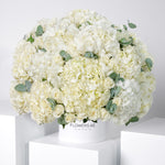 A combination of gorgeous white Roses, pink Hydrangeas and pink roses complemented by Eucalyptus greens in a hatbox will make the perfect gift to welcome a baby boy.