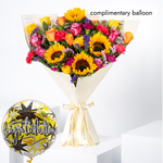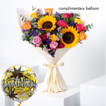 A striking hand-tied bouquet of vivid sunflowers, roses, carnations, statice, and lush greenery. Designed to celebrate life’s big wins, it’s the perfect gift for marking moments of success, joy, and unforgettable milestones.