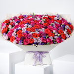 A striking blend of purple, pink, lilac, and red blooms, hand-tied for a natural, full look. Layered roses, lisianthus, and textured chrysanthemums meet seasonal autumn leaves for a bold, statement bouquet.
