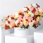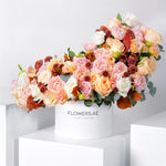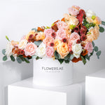 Romantic pastels meet autumn charm in this signature hatbox arrangement, brimming with roses, lisianthus, and textured foliage for an effortlessly elegant gift.