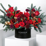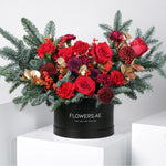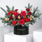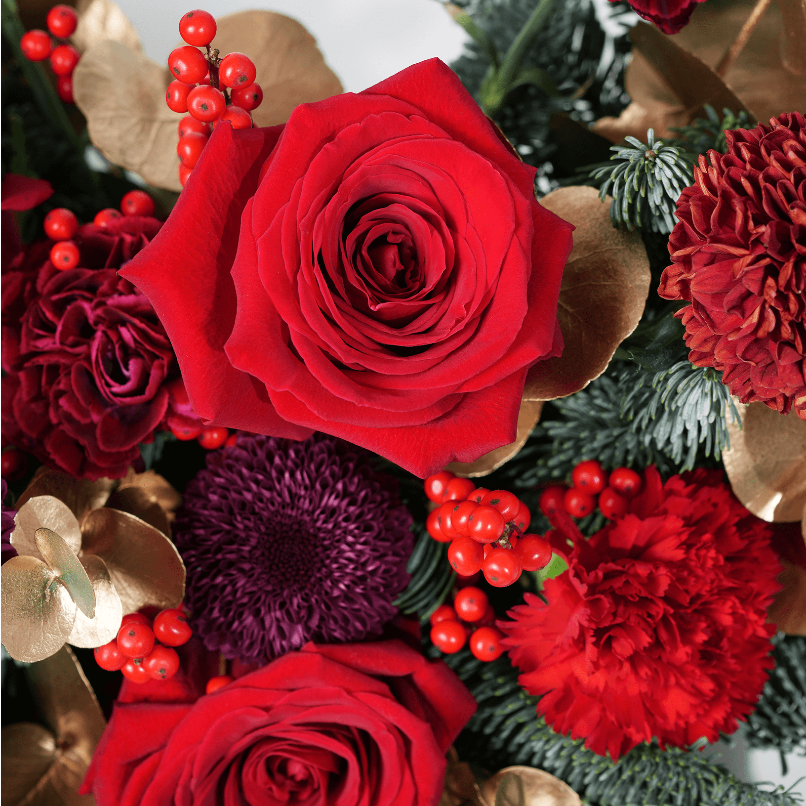 A lavish hatbox overflowing with red roses, burgundy carnations, ping-pong chrysanthemums, and festive Ilex berries. Golden eucalyptus and wintery Nobilis bring richness and dimension, making this the perfect gift for a truly enchanting holiday gesture.