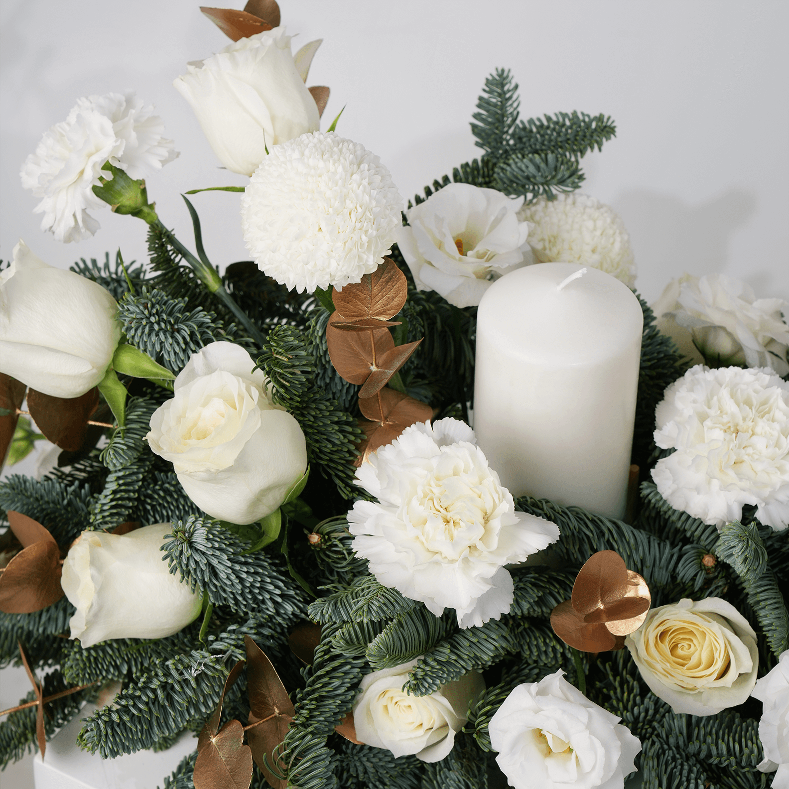 A serene winter-white centerpiece featuring elegant white roses, lisianthus, carnations, and round ping-pong chrysanthemums. Accented with shimmering gold eucalyptus and lush Nobilis, this arrangement is finished with graceful candles that cast a soft, warm glow, bringing refined elegance and peaceful winter charm to any holiday table.