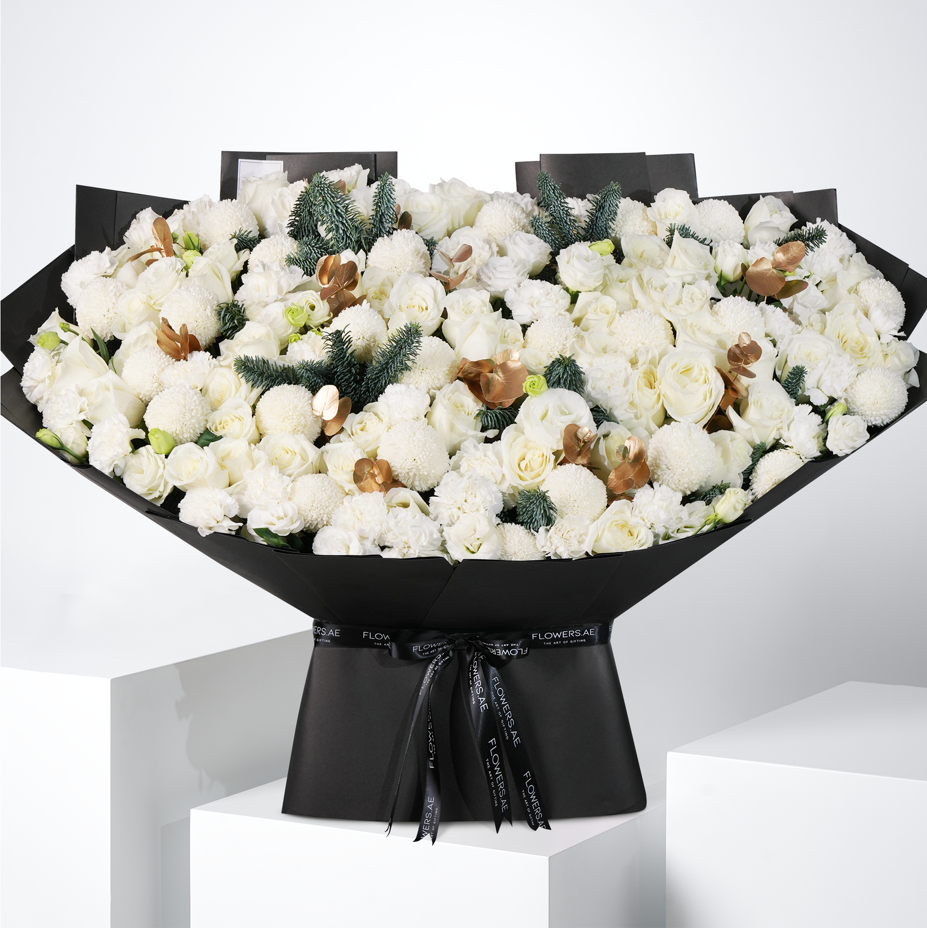 A serene grand white composition blending roses, lisianthus, carnations, and ping-pong chrysanthemums, finished with gold-touched eucalyptus and textured Nobilis. This hand-tied bouquet exudes quiet elegance and a soft seasonal glow, perfect for moments that call for celebration.
