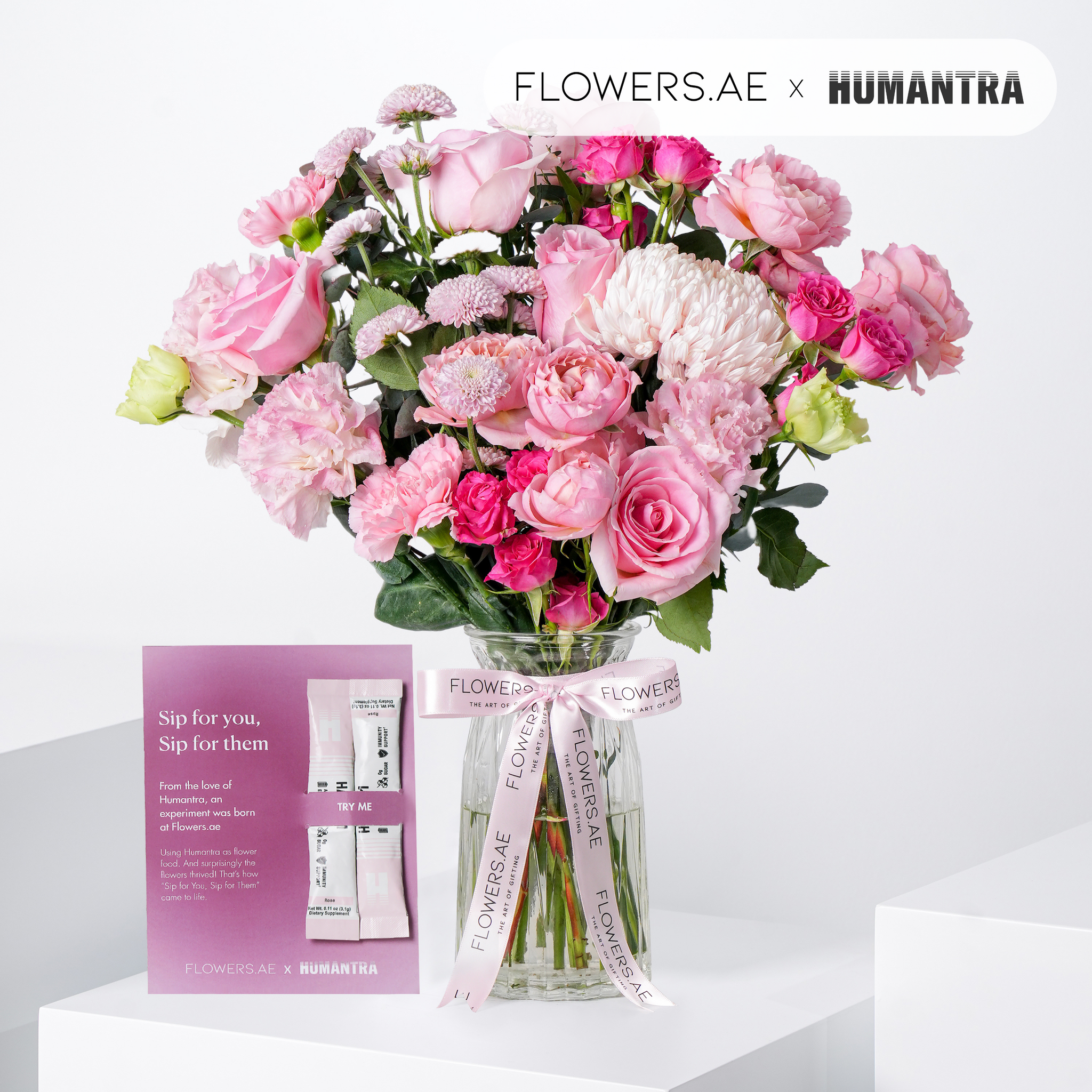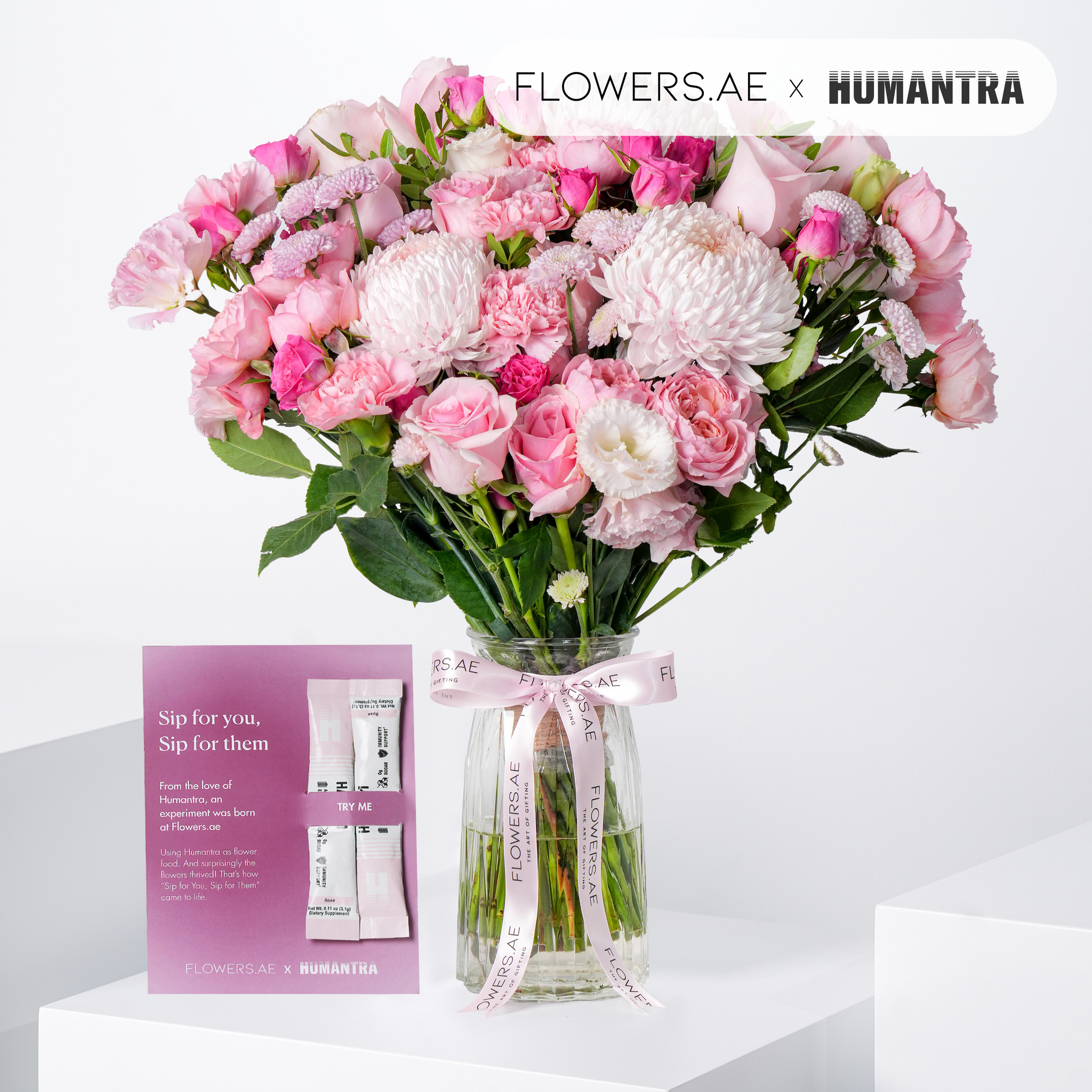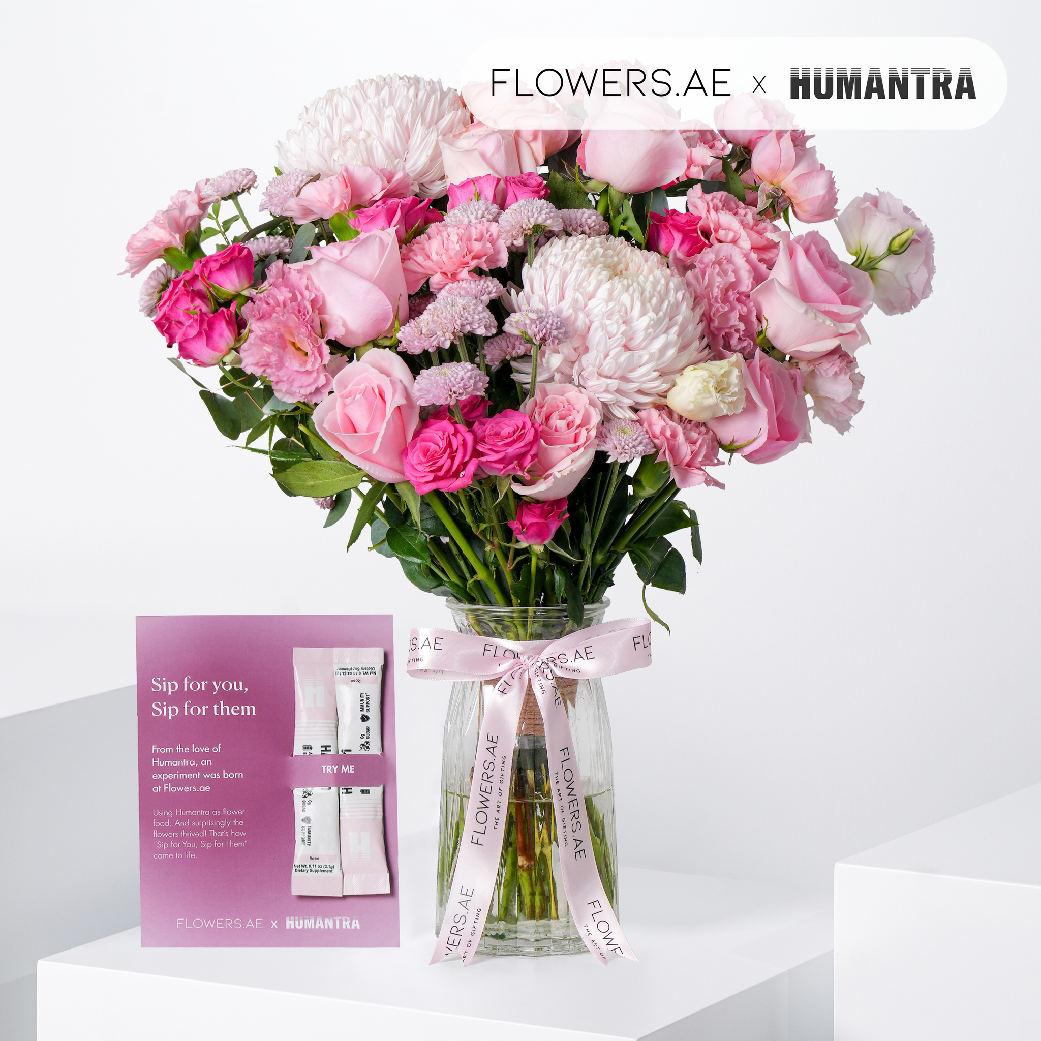 This elegant vase arrangement features a graceful blend of pink roses, lisianthus, and chrysanthemums, accented with pistache and eucalyptus for texture and natural movement. A timeless piece, it adds warmth and softness to any setting. In collaboration with Humantra, we discovered their sachets not only hydrate people but also help flowers thrive. A gift for both you and your blooms.