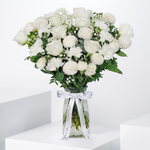 An enchanting white arrangement presented in a stylish vase, overflowing with roses, carnations, chrysanthemums, and delicate gypsophila. Soft greens add texture, making it a graceful and sophisticated gift for any occasion.