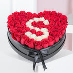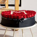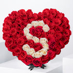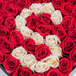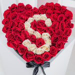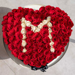 Our stunning signature letter Heart-Shaped Box is one of our most requested arrangements. Our classic heart-shaped box comes with a red rose background and white lettering.
