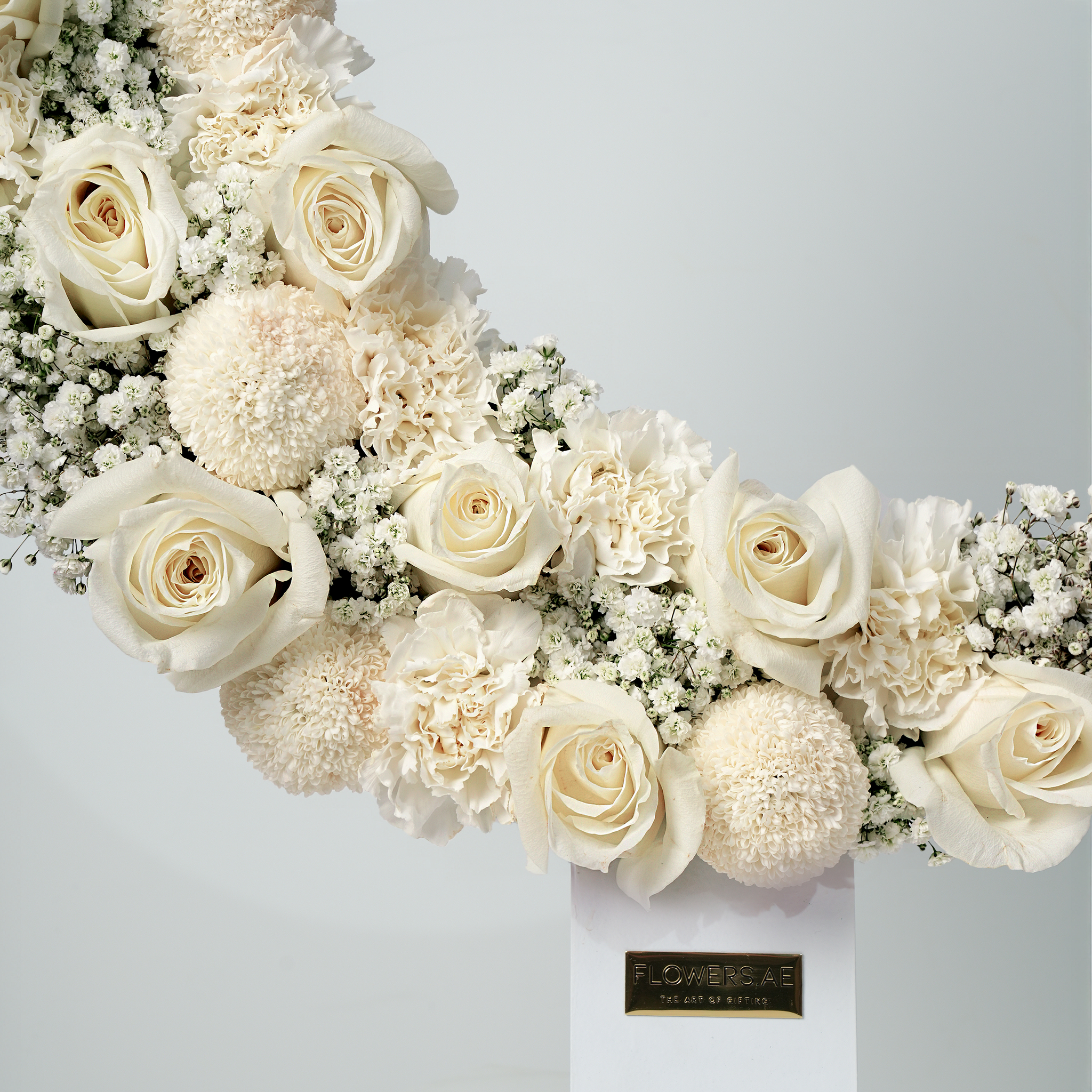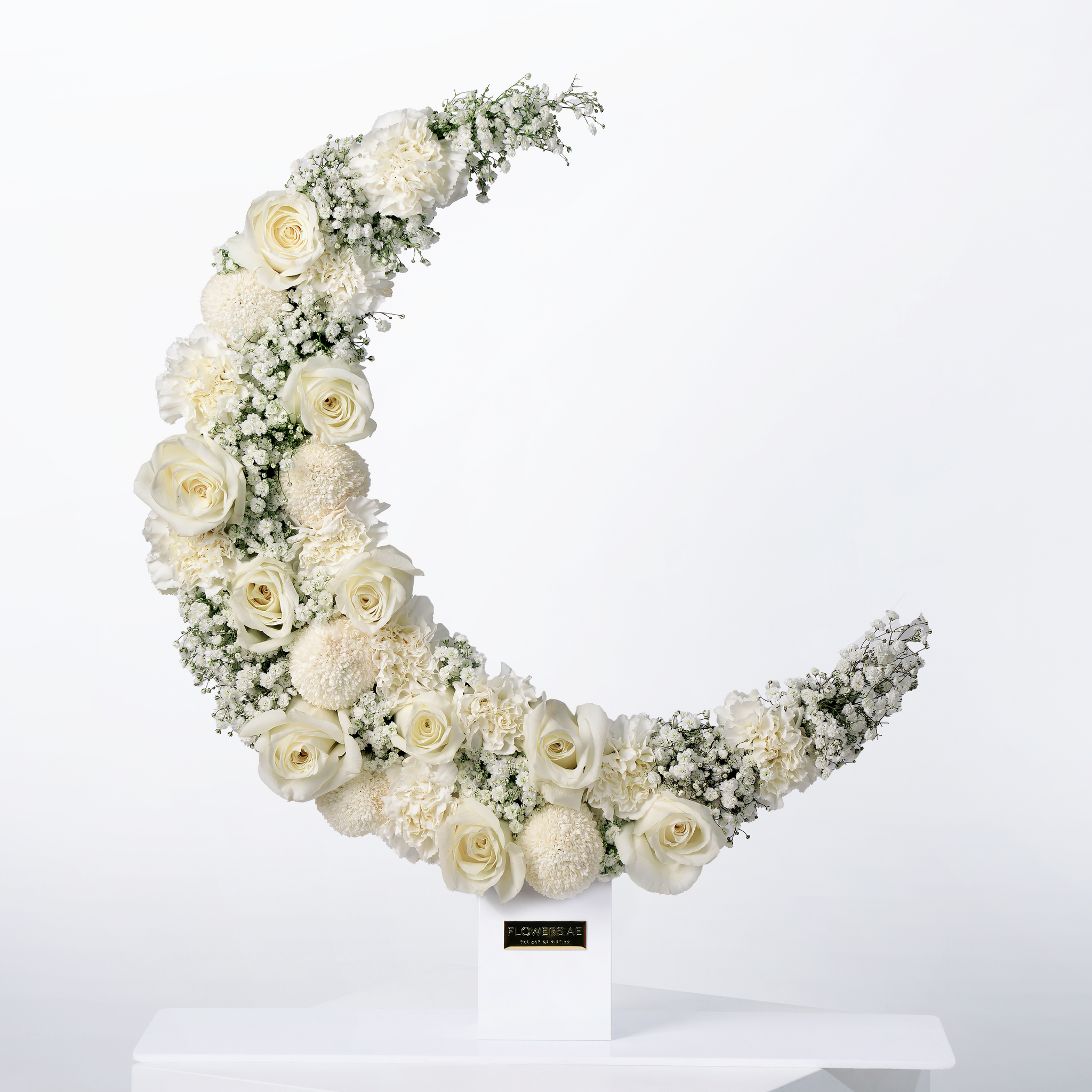 An enchanting white crescent overflowing with roses, carnations, chrysanthemums, and delicate gypsophila. Accented with soft greens, it offers a graceful and sophisticated crescent arrangement ideal for Ramadan hosting and Eid gifting.