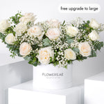 Our exquisite white flower arrangement, a harmonious blend of purity and elegance. A stunning ensemble of pristine O'hara roses, Vendela white roses, and White wax flowers with greeneries expertly crafted to evoke timeless beauty. Radiating serenity and grace, this perfect arrangement is an enchanting gift for any occasion, symbolising purity, love, and new beginnings.