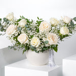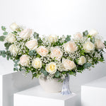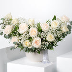 An exquisite white flower arrangement, a harmonious blend of purity and elegance. A stunning ensemble of pristine O'hara Roses, Vendela White Roses, and White Wax Flowers with greeneries expertly crafted to evoke timeless beauty. Radiating tranquility and grace, this perfect arrangement is an enchanting gift for any occasion, symbolizing purity, love, and new beginnings.