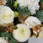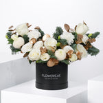 A petite hatbox brimming with velvety white roses, lisianthus, carnations, and textured ping-pong chrysanthemums. Gold eucalyptus and rich Nobilis add depth and a festive touch, creating a sophisticated arrangement that feels both modern and timeless.