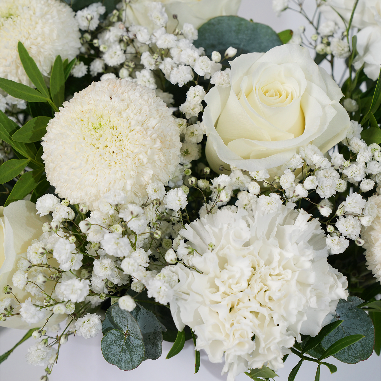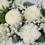 An enchanting white arrangement presented in a stylish petite hatbox, overflowing with roses, carnations, chrysanthemums, and delicate gypsophila. Soft greens add texture, making it a graceful and sophisticated gift for any occasion.