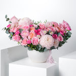 This elegant vase arrangement brings together a harmonious blend of pink roses, lisianthus, and chrysanthemums. With touches of pistache and eucalyptus for texture and movement, it’s a timeless piece that adds warmth and softness to any space.