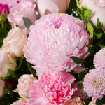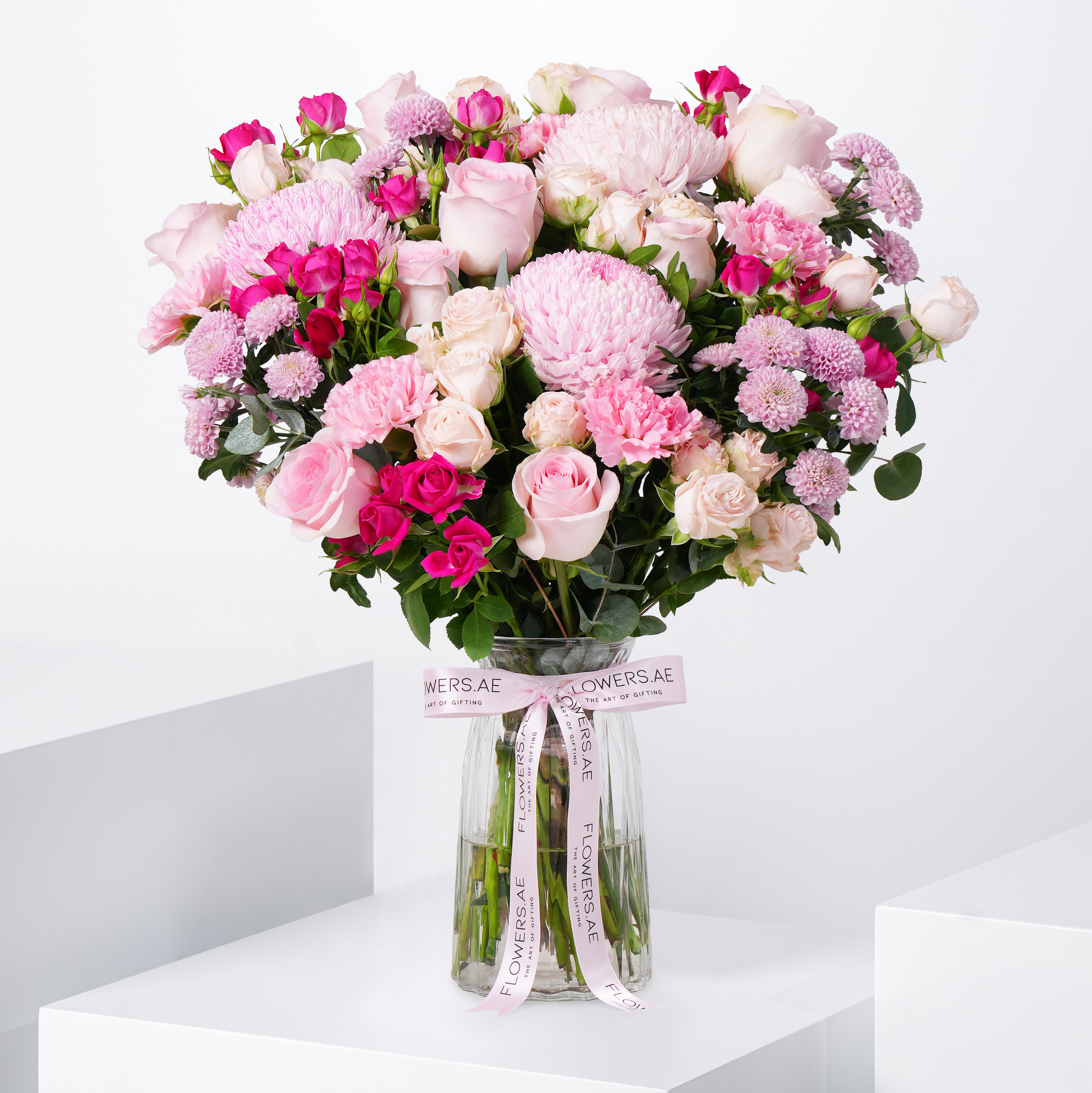 Created for Valentine’s Day, this refined vase arrangement blends pink roses, carnations, and chrysanthemums, accented with pistache and eucalyptus for gentle texture. A timeless floral expression of warmth, romance, and elegance.