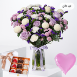 Created for Valentine’s Day, this refined vase arrangement features frilled purple lisianthus, roses, white carnations, white chrysanthemum ping pongs, and purple statice. An exquisite floral expression of romance and grace.