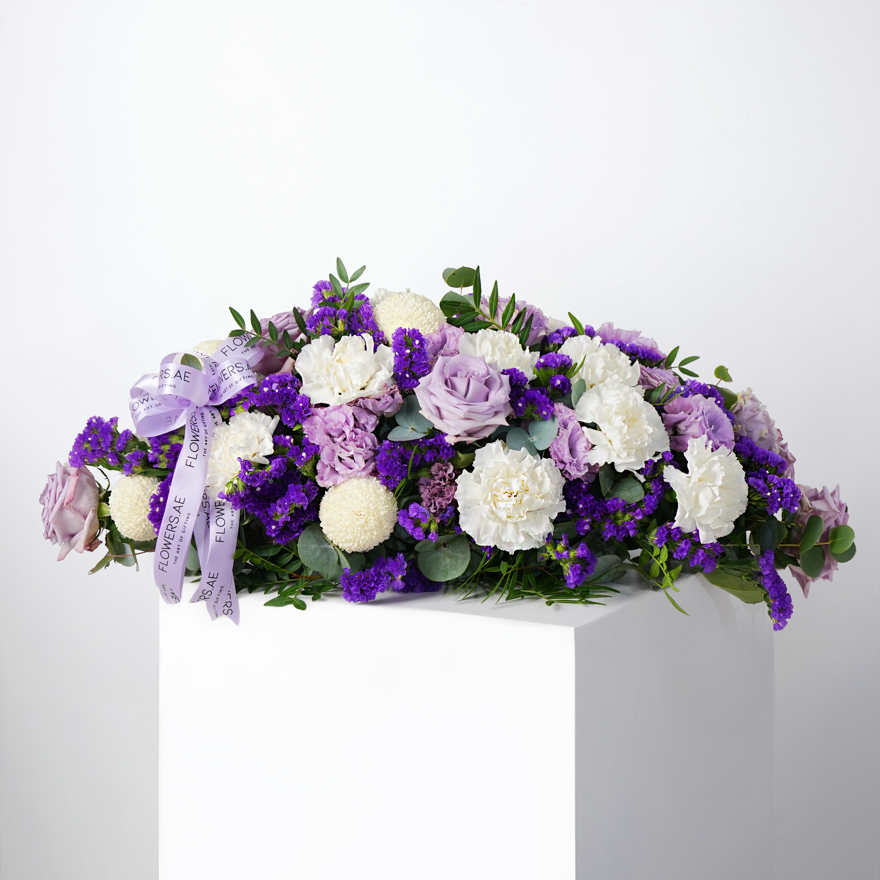 An artful table centerpiece blending frilled purple lisianthus, roses, white carnations, white chrysanthemum ping pongs, and purple statice. A refined table centerpiece designed to elevate Ramadan gatherings and Eid celebrations.