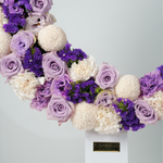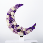 An artful crescent blending frilled purple lisianthus, roses, white carnations, white chrysanthemum ping pongs, and purple statice. A refined crescent design created to elevate Ramadan gatherings and Eid celebrations.