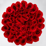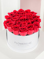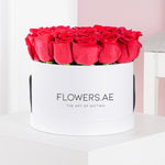This elegant hatbox features premium red roses, hand-crafted with a stylish design and classic black ribbon. A perfect gift to brighten any occasion and show your love.