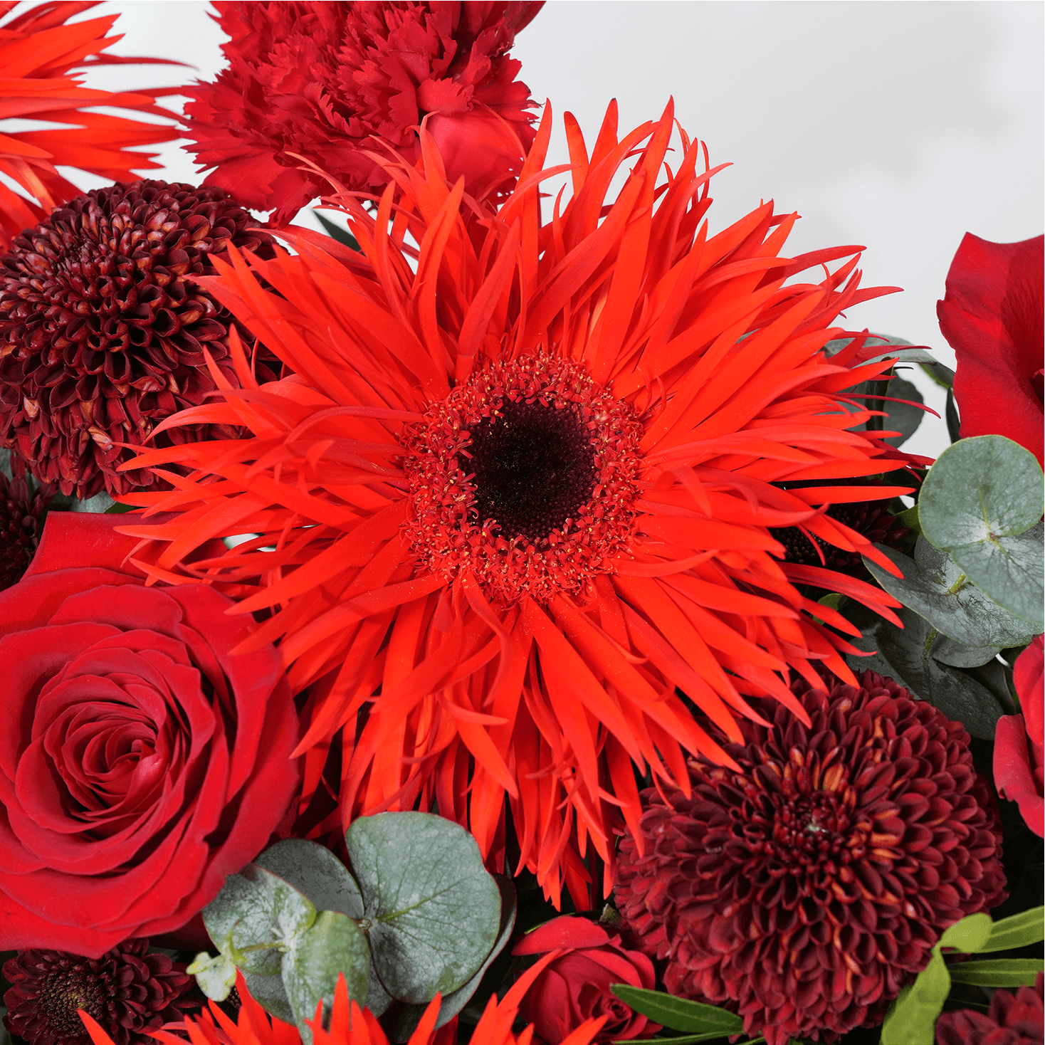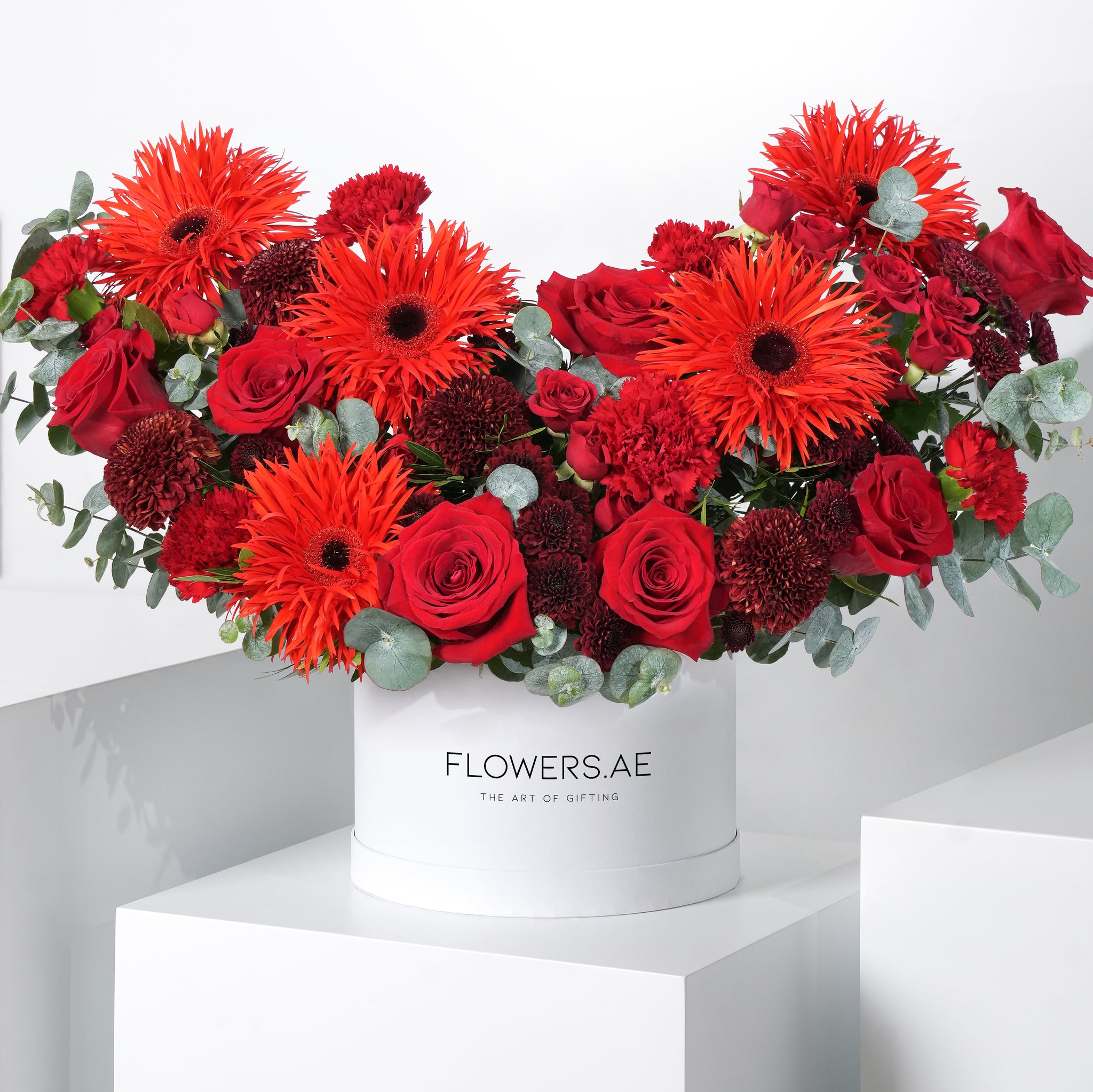 A luxurious hatbox overflowing with rich red roses, carnations, and garden-style textures. Gerberas, Santini blooms, and fresh foliage come together in a lush, modern presentation, perfect for gifts that leave a lasting impression.