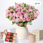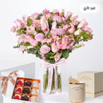 Celebrate their return with an elegant embrace of soft pinks — fuchsia roses, carnations, alstroemeria, and pink ping pong chrysanthemums. A heartfelt way to say, “We missed you.”