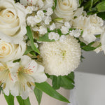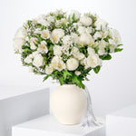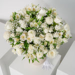 A timeless and elegant arrangement that radiates sophistication, featuring the delicate Gypsophila, the pure beauty of White Carnation, the graceful Alstroemeria White, classic White Roses, and the pristine White Ping Pong Chrysanthemums. This soft and refined bouquet is perfect for creating a calm, elegant atmosphere.