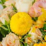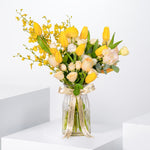 Inspired by the golden glow of early morning light, this warm and radiant arrangement features cheerful yellow tulips, sunny ping pong chrysanthemums, and soft peach lisianthus. With touches of oncidium and buttery-hued roses, it’s the perfect way to brighten someone’s day.