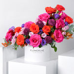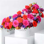 Saturated tones of violet, fuchsia, lilac, and red, artfully styled in our signature hatbox. Lush roses, lisianthus, and chrysanthemums create a plush, dimensional piece that feels luxe and undeniably seasonal.
