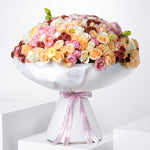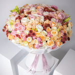 A graceful blend of soft whites, peach tones, and warm autumn textures, this bouquet pairs roses, lisianthus, and chrysanthemums with gentle foliage and seasonal leaves for a look that’s as comforting as the season.