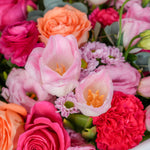 A joyful celebration of bold colors, this lively arrangement bursts with personality. Featuring bright pink tulips, vivid carnations, and lush pink lisianthus, it’s paired with striking roses and soft lavender-hued chrysanthemums. Designed to energize and delight, this vibrant arrangement brings a pop of happiness.