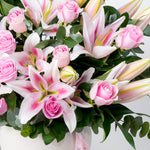 A graceful vase composition of pink roses, soft pink lilies, and fresh greenery—this elegant arrangement is a timeless expression of love, purity, and fresh beginnings. Perfect for marking meaningful moments.